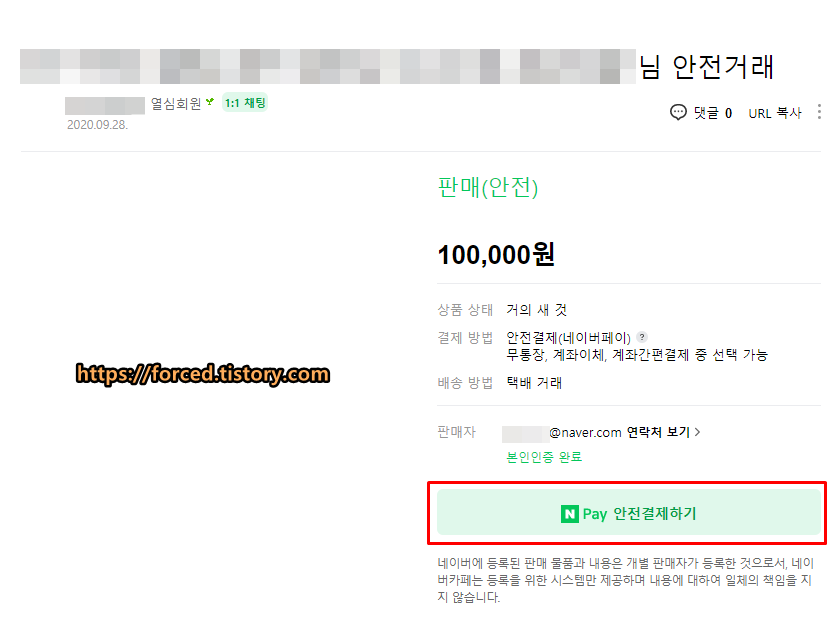 중고나라 판매자와 안전거래 합의가 되었다면, 판매자는 네이버 페이 결제가 가능하도록 판매글을 수정하던지 새로 올리던지 할 것입니다. 판매글에 보이는 'N Pay 안전결제하기'를 눌러줍니다. 참고로 안전거래 수수료는 판매자가 내는 것이며, 판매 가격은 안전거래 수수료가 포함된 가격입니다.