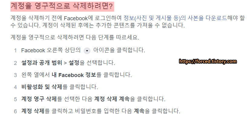 페이스북 공식 홈페이지에 있는 계정 영구 삭제 방법입니다. (계정 삭제 신청 과정은 아래를 참고해주세요.)
