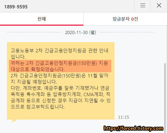 11월 30일 월요일, 1899-9595(고용안정지원금 고객센터)에서 문자가 왔습니다. 문자에는 지원금 지급 심사 끝에 제가 지원 대상으로 확정되었다는 내용과 지원금은 11월 말까지 지급될 것이라는 내용이 들어있었습니다. 바로 오늘이 11월 말인데..