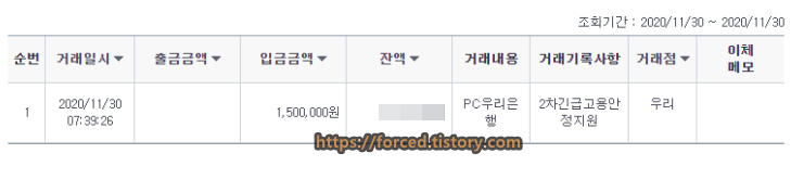 11월 중에 지급된다던 2차 긴급고용안정지원금은 11월 끝자락인 11월 30일 월요일 07시 40분경에 들어왔습니다. 지원금 입금액은 150만 원이었고, 거래기록사항에는 '2차긴급고용안정지원'이라고 적혀있었습니다.