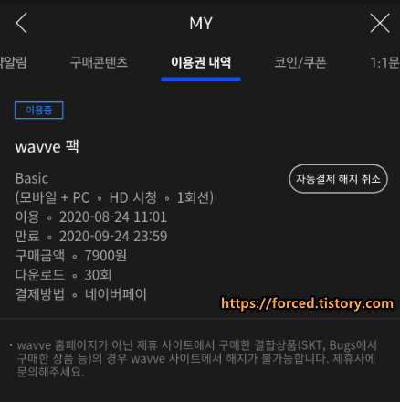 어느 날 '네이버파이낸셜'로 7,900원이 결제되었다. 난 이 시간에 결제한 것도 없는데 이 결제 문자는 도대체 무엇일까?. 미스터리한 이 결제 문자에 대해 곰곰이 생각해봤다. 답은 생각보다 금방 나왔다. 범인은 바로 '웨이브 이용권 자동결제'였다. 요즘은 웨이브를 자주 이용하지 않아서 해지하려고 했었는데. 결제일 이전에 자동 결제 해지하는 것을 깜빡했나 보다. 이왕 결제된 거 어쩔 수 없이 이번 달까지 이용은 하겠지만 자동 결제는 미리 해지해둬야겠다.