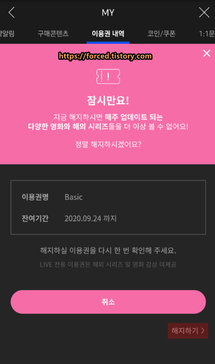 참고로 이용권 내역에 있는 '자동결제 해지 취소'를 누르면 자동결제 해지 신청이 취소된다.