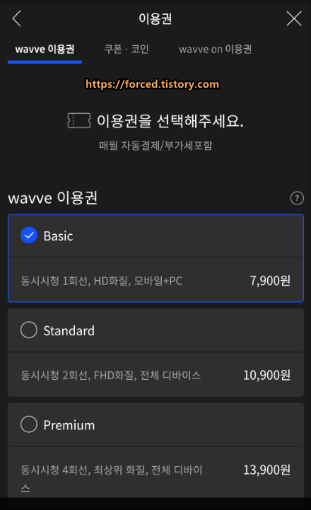 웨이브 이용권은 Basic(7,900원), Standard(10,900원), Premium(13,900원) 이렇게 3가지로 나눠서 판매되고 있다. 그리고 이용권 등급마다 동시 시청 허용 회선(1회선~4회선)이 다르며, 최대 지원 화질(HD~최상위) 또한 다르다.