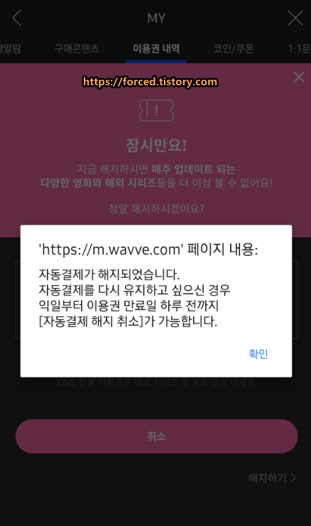 해지하기를 누르니 자동결제는 바로 해지되었다. 이제 웨이브 자동 결제는 끝이다.!!
