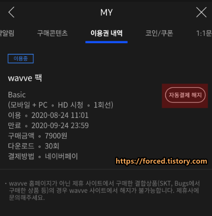 이용권 내역 탭에 있는 '자동결제 해지'를 눌러준다.
