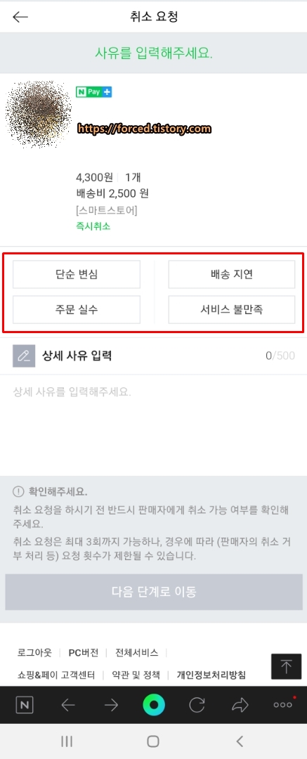 먼저 주문 취소 사유(단순 변심, 배송지연, 주문 실수, 서비스 불만족)를 선택해줍니다. 그리고 아래에 보이는 상세 사유를 입력해줍니다. 모두 빠짐없이 입력했다면 맨 아래에 있는 '다음 단계로 이동'을 눌러줍니다.
