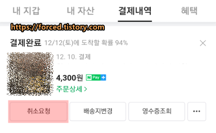 네이버페이(N pay)로 주문한 상품이 현재 '입금확인중' 또는 '결제완료' 상태라면 주문 취소 시 바로 환불 처리가 됩니다. 그러나 현재 주문 상태 '상품준비중'이라면 판매자가 상품의 발송 여부를 확인하여 발송하지 않은 경우에만 취소 승인을 하므로 주문 취소 전에 판매자에게 문의하여 택배 발송 여부를 확인해야 합니다.