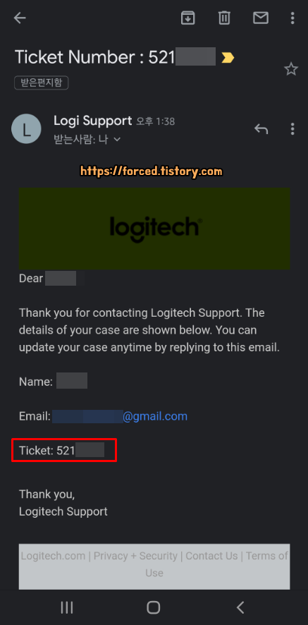이메일 주소를 불러주면 상담원은 이런 메일을 보내면서 티켓(Ticket) 번호를 물어볼 텐데요. 통화는 끊지 않은 상태에서 메일을 확인해 티켓 번호를 불러줍니다. 티켓 번호 확인까지 해줬다면 A/S 접수는 끝난 것입니다. 티켓 번호 확인을 끝으로 상담원은 A/S 신청 가이드를 메일로 보내줄 테니 통화 종료 이후 확인하라고 하면서 통화를 종료할 것입니다.