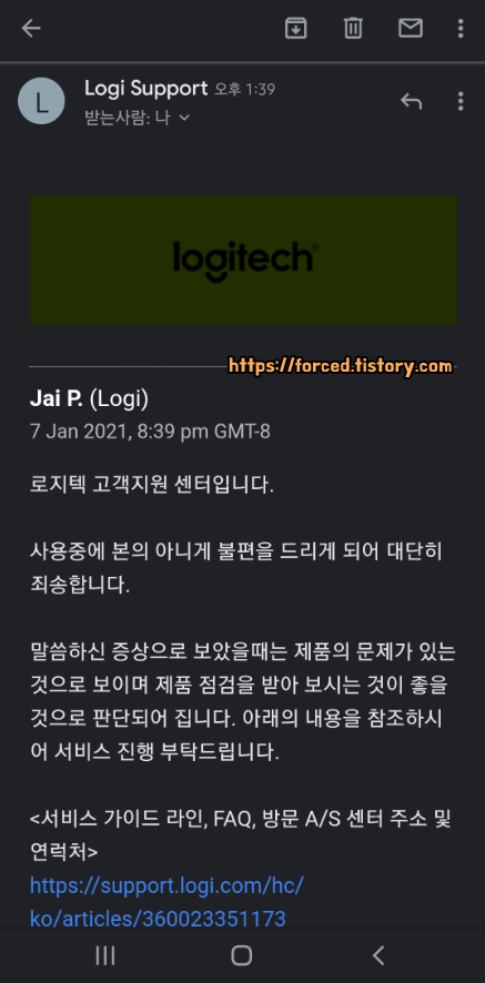 통화 종료 이후, 메일함을 확인해보니 로지텍에서 이렇게 한글로 된 A/S 가이드를 추가로 보내줬네요. 여기에는 한글로 A/S 접수 번호와 접수 방법이 자세히 적혀있습니다.