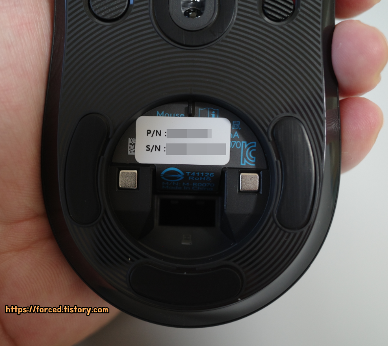 마우스 뒷면 무게추 넣는 곳을 열어봤습니다. 이렇게 제품번호(P/N)와 시리얼 넘버(S/N)가 이전에 쓰던 것 그대로 덮어 씌워진 것을 확인할 수 있습니다.