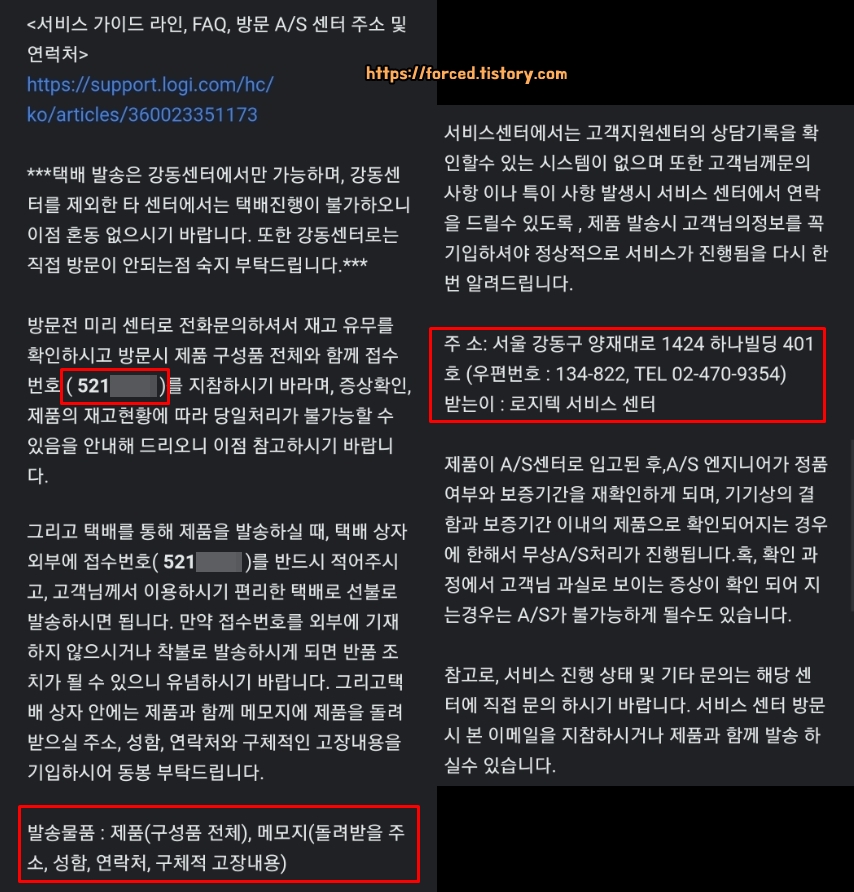 메일로 받은 A/S 가이드에는 A/S 접수번호와 발송해야 할 물품 그리고 로지텍 서비스센터 주소가 적혀있습니다. 여기서 발송 물품 부분을 보면 "구성품 전체"라고 적혀있는데 마우스 외 구성품은 있는 대로 보내주면 됩니다.