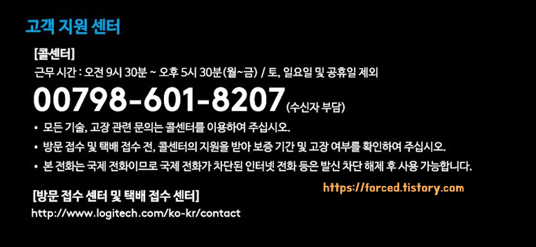 로지텍 마우스 A/S 신청은 로지텍 고객센터 전화를 통해 할 수 있습니다. 로지텍 고객지원 센터 번호는 00798-601-8207입니다. 해당 번호는 국제전화인데 통화료는 수신자 부담이니 통화료 걱정은 하지 않아도 됩니다. 로지텍 고객 지원 센터는 평일에만 운영하며, 운영 시간은 한국 시간 기준 오전 09시 30분부터 오후 5시 30분까지입니다. 토요일과 일요일 그리고 공휴일은 운영하지 않으니 참고하세요.