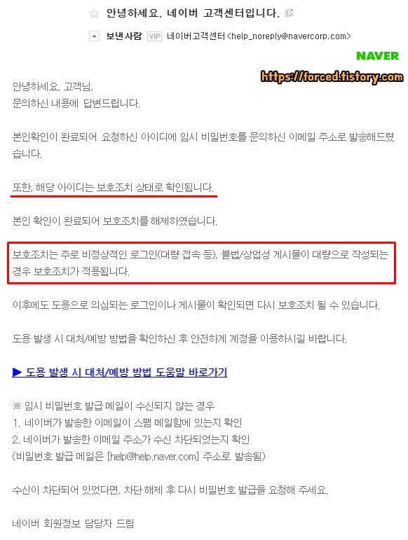 먼저 "안녕하세요. 네이버 고객센터입니다." 메일입니다. 제 계정이 보호조치되어있었나 보군요. 보호조치는 비정상적인 로그인, 불법/상업성 게시물 대량 작성 등으로 보호조치가 적용된다고 하네요.