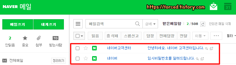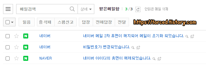 임시 비밀번호로 로그인한 이후, 메일함을 살펴봤습니다. 메일함에는 비밀번호 변경 안내 메일과 휴면 해제 메일이 차례로 들어와 있네요.