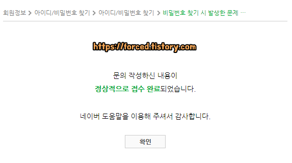 임시 비밀번호 발급 문의 폼 작성을 끝내면 이렇게 접수가 완료됩니다. 입력했던 정보에 문제가 없다면 임시 비밀번호는 다음날 입력했던 이메일로 발급될 것입니다.