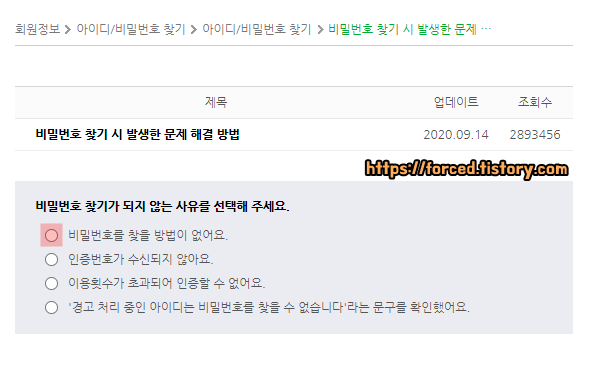그러면 이렇게 비밀번호 찾기가 되지 않는 사유를 선택하라고 나오는데요. 여기서 "비밀번호를 찾을 방법이 없어요"를 선택해줍니다.