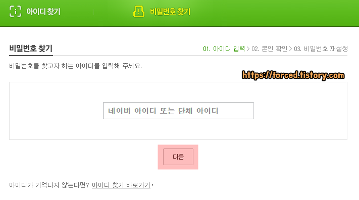 네이버 아이디를 입력한 후, 아래에 다음 버튼을 눌러줍니다.