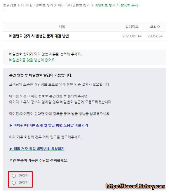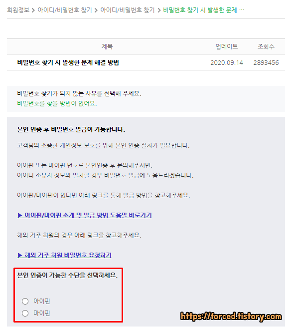 참고로 임시 비밀번호 발급 문의는 아이핀 또는 마이핀 인증을 해야지만 진행할 수 있습니다.