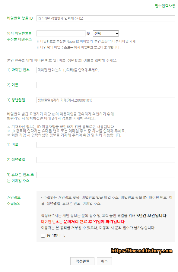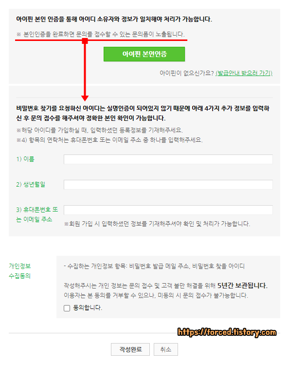 아이핀 인증을 마치면 이렇게 임시 비밀번호 발급 문의 폼이 노출됩니다. 이름, 생년월일, 휴대폰번호 또는 이메일주소를 입력한 후, 아래에 작성완료 버튼을 눌러줍니다. 참고로 저는 휴대폰번호 또는 이메일주소에 '모름'이라고 입력했습니다.