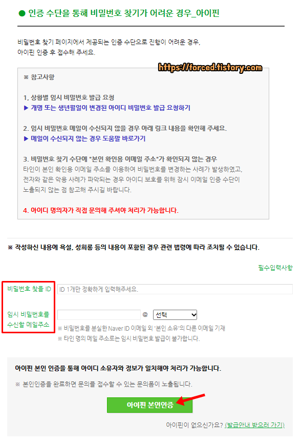 비밀번호 찾을 ID와 임시 비밀번호를 수신할 메일주소를 입력한 후, 아래에 아이핀 본인인증 버튼을 눌러줍니다.