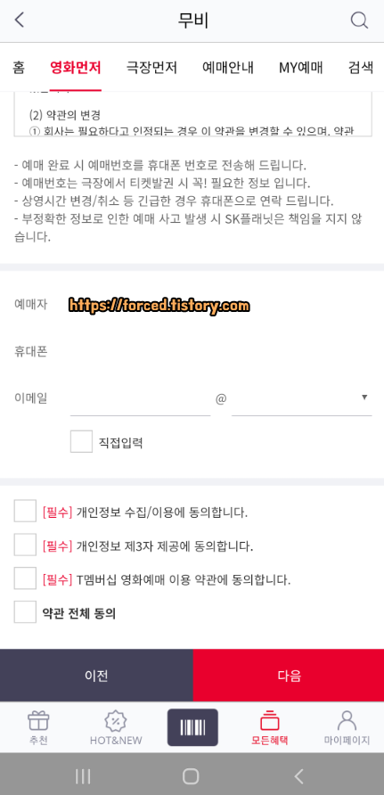 이메일을 입력한 후, 개인정보 수집 및 T멤버십 영화예매 이용 약관(필수)에 동의를 해줍니다.