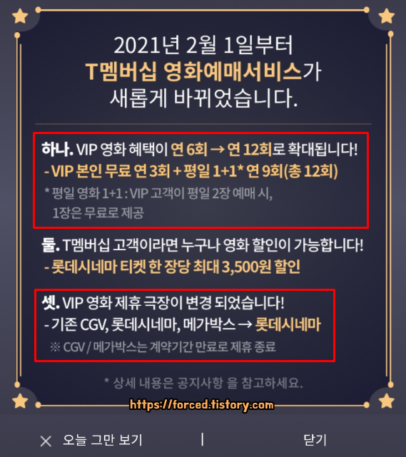 1. VIP 영화 예매 혜택 연 6회 > 연 12회 (VIP 영화 무료 3회 + 평일 1+1 연 9회)