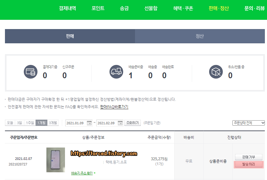 구매자가 구매확정 버튼을 21년 02월 09일 화요일에 눌러줬으니까 판매 대금 정산은 21년 02월 10일 수요일에 되겠네요.