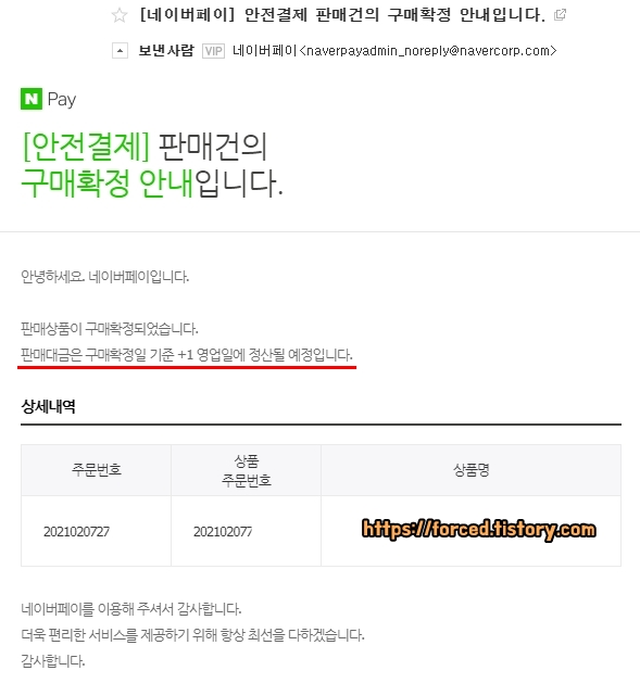 택배를 수령한 구매자는 물건에 이상이 없다면 구매 확정 버튼을 눌러줄 것입니다. 그리고 구매 확정일로부터 1 영업일이 지났을 때 네이버에서 판매자의 계좌로 판매 대금(안전거래 수수료를 뺀 금액)을 입금해줄 것입니다.