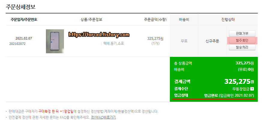 입금 상태가 '입금완료'로 바뀌면 진행 상태에 '발주확인'이라는 버튼이 보일 것입니다. 이 버튼을 눌러줍니다.