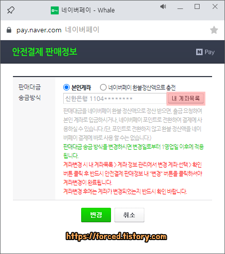 바로 여기서 판매대금 송금방식을 변경할 수 있습니다. '본인계좌' 또는 '네이버페이 환불정산액으로 충전'을 선택할 수 있죠. 그리고 여기서 '내 계좌목록'을 눌러 입금 계좌를 변경할 수도 있습니다.