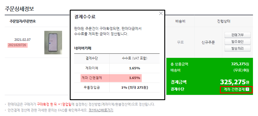참고로 상품 금액이 325,275원이고, 결제 수단이 '계좌 간편결제'라면 안전거래 수수료는 5,367원입니다.