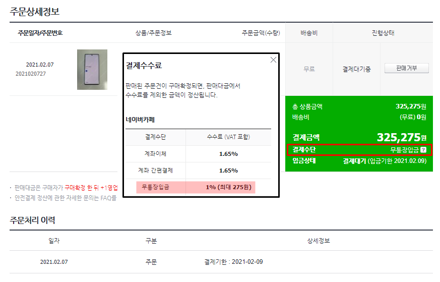 그러면 이렇게 주문상세정보 창으로 이동되는데요. 여기서 결제 수단을 확인해보니 구매자는 수수료가 비교적 많이 드는 계좌 간편결제(수수료 1.65%)로 결제를 했네요. 상품 금액이 적다면 안전 거래 수수료야 얼마 안 나오겠지만 상품 금액이 몇십만 원대라면 수수료가 꽤나 많이 나올 것입니다. 무통장입금으로 거래하면 최대 수수료가 275원인데 안전거래까지 하면서 괜히 손해 볼 필요는 없겠죠?