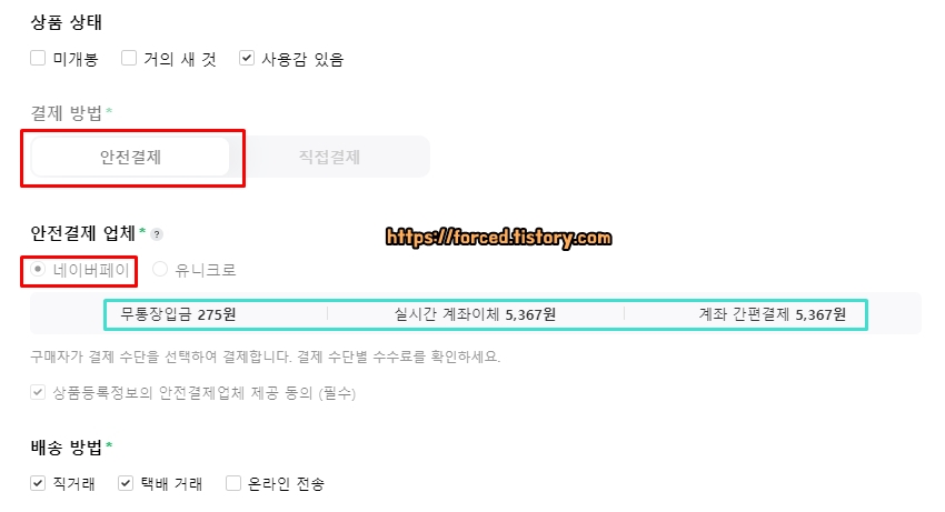 먼저 안전거래를 하려면 판매글을 올릴 때, 결제 방법을 '안전결제'로 체크해야 합니다. 안전거래 수수료는 결제 수단마다 조금씩 다릅니다. 참고로 안전거래 수수료가 제일 저렴한 것은 '무통장입금(최대 275원)'입니다.