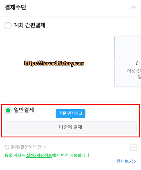 참고로 무통장 입금을 하려면 일반결제에 있는 '주문 먼저하고 나중에 결제'를 눌러줘야 합니다. '계좌 간편결제'와 '무통장 입금'은 다른 거예요. 계좌에서 돈이 빠져나간다는 것은 같지만요.. 무통장 입금 못 찾아서 계좌 간편결제로 결제하는 거 이해합니다.