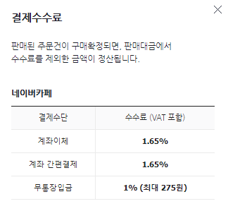 네이버페이 안전거래 수수료는 계좌이체 1.65%, 계좌 간편결제 1.65%, 무통장입금 1%(최대 275원)입니다. 보통 안전거래 시 수수료가 제일 적은 무통장입금으로 거래합니다.