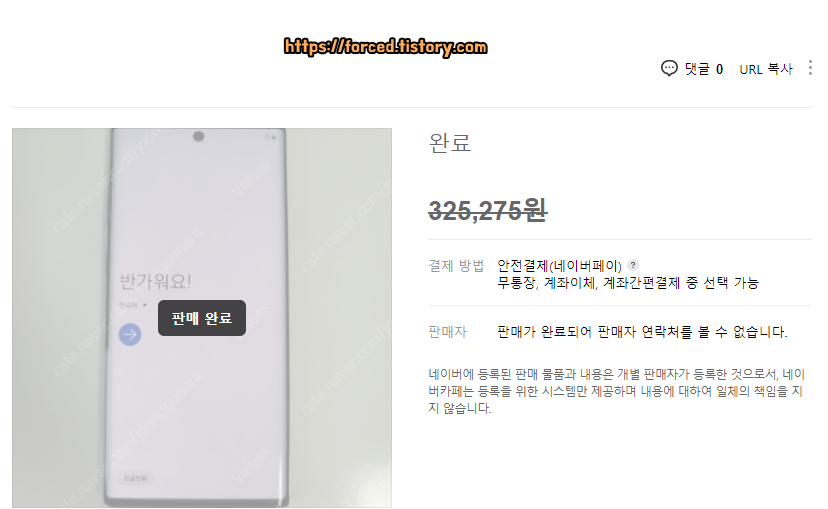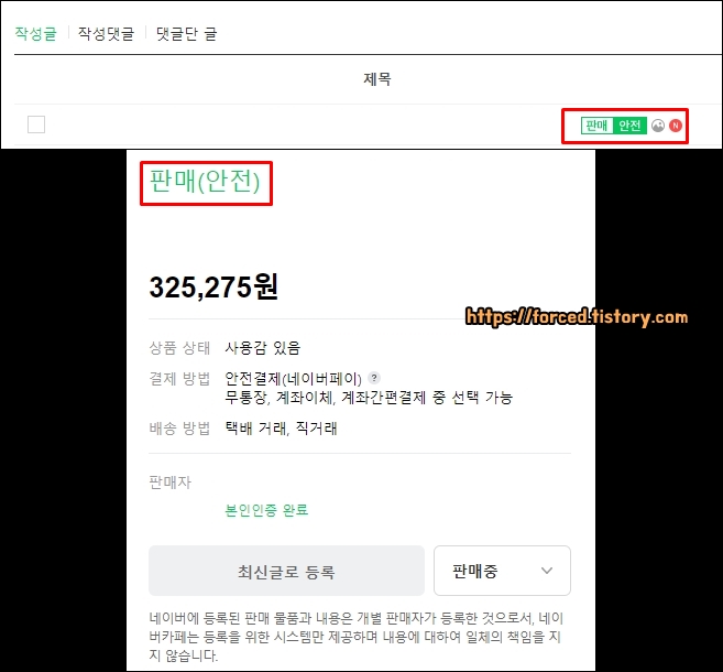 구매자가 네이버페이 안전결제를 통해 물건 값 지불을 완료하면 판매글이 '판매 완료' 상태로 변경됩니다.