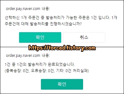 그러면 이렇게 "발송처리를 진행하시겠습니까?"라는 창이 뜨는데요. 여기서 확인 버튼을 누르면 발송 처리가 완료됩니다.