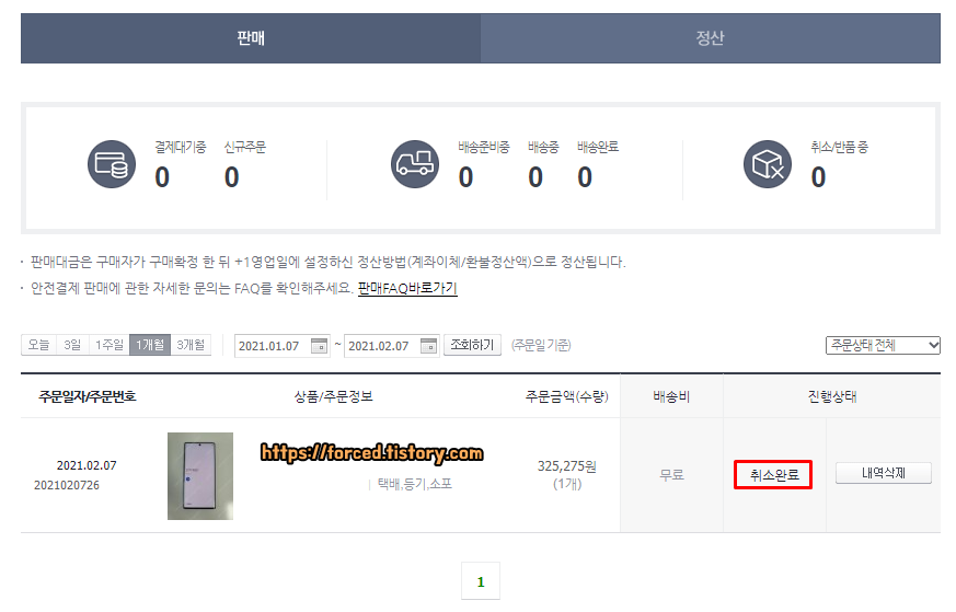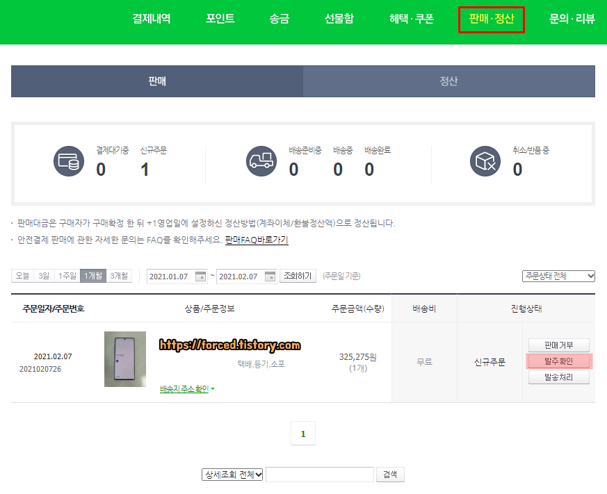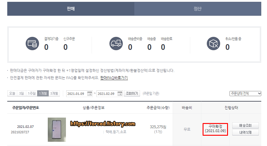 구매자가 구매확정 버튼을 21년 02월 09일 화요일에 눌러줬으니까 판매 대금 정산은 21년 02월 10일 수요일에 되겠네요.