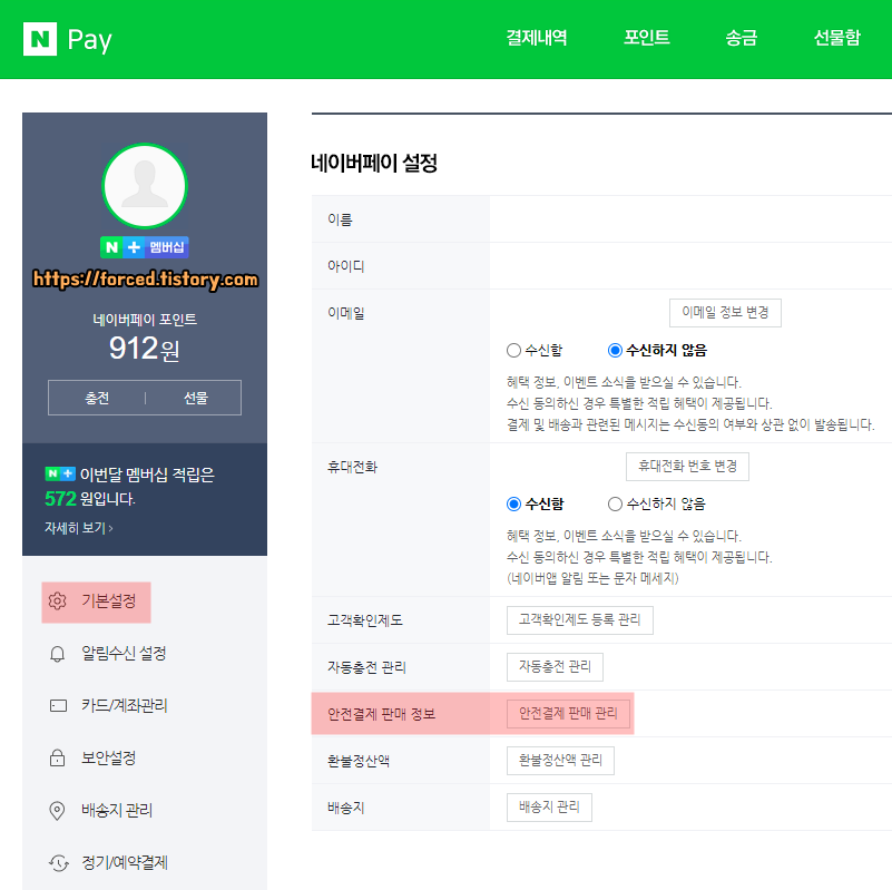 안전 거래 정산 방식 변경 방법은 매우 간단합니다. 일단 먼저 네이버페이 좌측에 보이는 '기본설정'을 눌러줍니다. 그리고 안전결제 판매 정보에 있는 '안전결제 판매 관리'를 눌러줍니다.