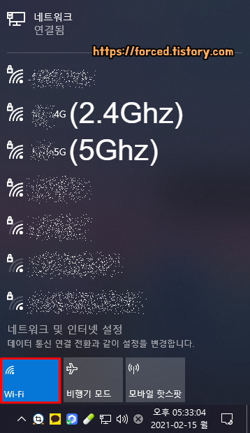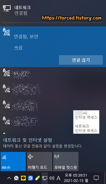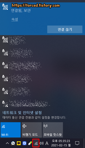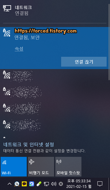 우측 하단 작업 표시줄에 와이파이 모양 아이콘도 보일 것입니다. 해당 아이콘을 클릭하면 연결 상태를 확인하거나 연결을 끊을 수 있죠.