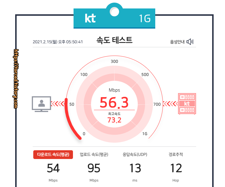 이번엔 2.4Ghz 와이파이에 연결한 후, 속도 테스트를 해봤습니다. 테스트 결과 다운로드 속도는 평균 54 Mbps, 업로드 속도는 평균 95 Mbps 정도로 나오네요. 그리고 응답속도도 유선랜에 비해 3ms 정도 늘어났네요. 유선랜 상태에서 했던 속도 테스트 결과와 많은 차이를 보이고 있습니다.
