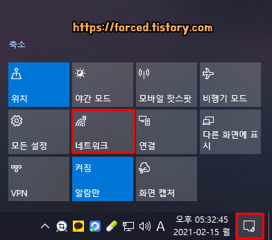 전원 연결을 완료했으니, 이제 와이파이를 연결해봅시다. 우측 하단에 보이는 알림 센터 아이콘을 누른 후, '네트워크'를 눌러주세요.