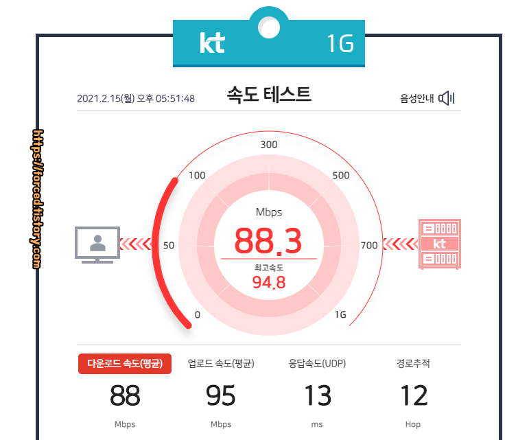 마지막으로 5G 와이파이에 연결한 후, 속도 테스트를 해봤습니다. 테스트 결과 다운로드 속도는 평균 88 Mbps, 업로드 속도는 평균 95 Mbps, 응답 속도는 이전과 동일한 13ms 정도가 나오네요. 2.4Ghz 와이파이보다 더 나은 성능을 보여주네요.