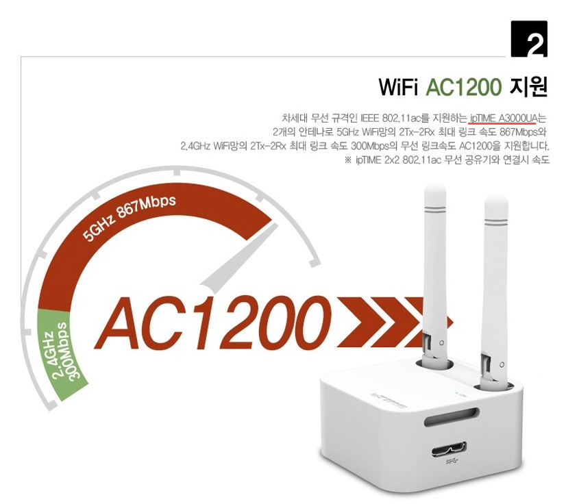 ipTIME A3000UA는 USB 3.0 인터페이스를 사용하기 때문에 최대 5G WIFI까지 이용할 수 있습니다. 기존 USB 2.0의 480 Mbps에 비해 10배 이상 빠른 속도를 지원합니다.