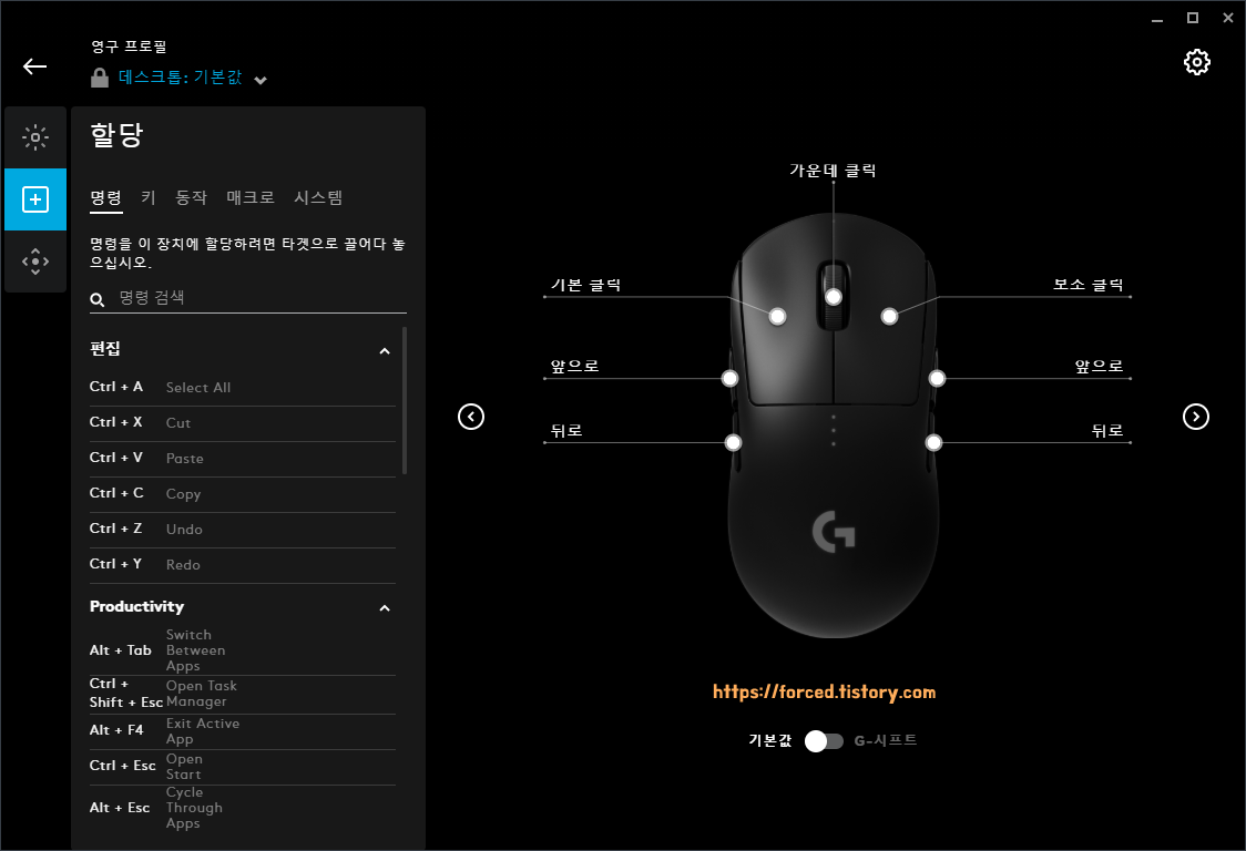 마우스 버튼별로 어떠한 명령을 각각 할당할 수도 있습니다. 참고로 저는 마우스의 사이드 버튼은 잘 사용하지 않기 때문이 이 기능은 사용하지 않죠.