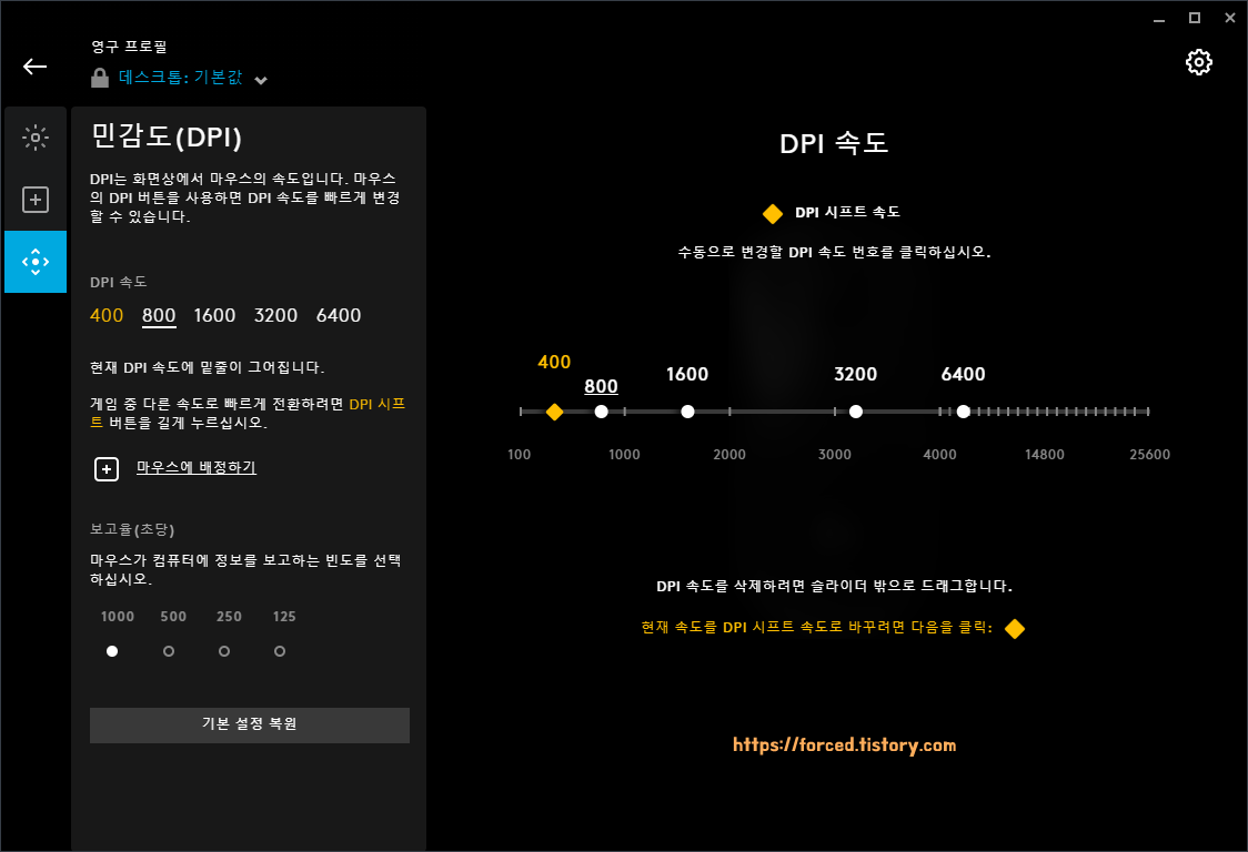 마지막으로 민감도 설정입니다. 여기서 본인이 원하는 마우스 민감도(DPI)를 선택할 수 있어요. 여기서 인생 감도를 한 번 찾아보세요.!!