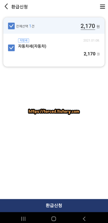환급금을 확인한 후, 아래에 보이는 '환급신청'을 눌러줍니다.