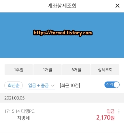 신청 당일 오후 5시 15분쯤 되니까 자동차세 환급액 입금이 완료됐습니다. 이걸로 시원한 아메리카노나 한 잔 해야겠네요. 참고로 저는 자동차세 환급 신청을 오전 10시쯤 했습니다.