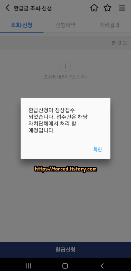 그러면 이렇게 환급 신청 접수가 완료됩니다. 이제 환급금이 입금될 때까지 기다리면 됩니다. 환급금 입금은 보통 신청 당일에 바로 처리됩니다. (환급 신청 즉시 돈이 바로 들어오지는 않음)