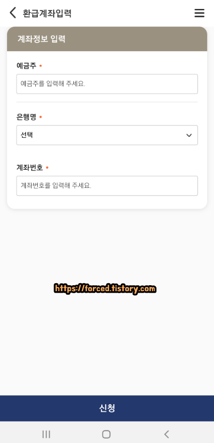 환급 계좌 정보(예금주, 은행, 계좌번호)를 입력해줍니다. 입력을 완료했다면, 아래에 신청 버튼을 눌러줍니다.